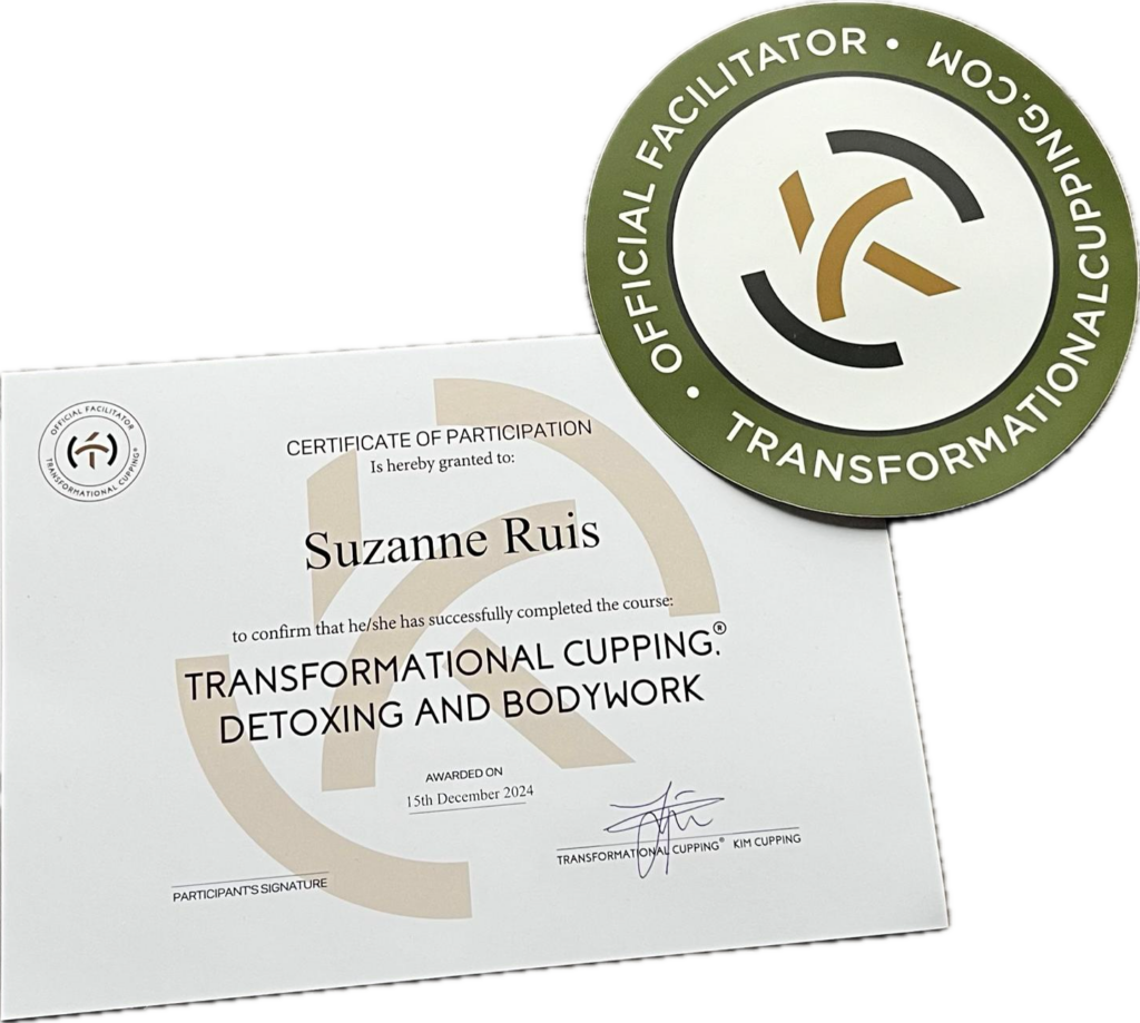 Met trots heb ik mijn certificaat in Transformational Cupping behaald. Dit certificaat laat zien dat ik volledig ben opgeleid in deze bijzondere therapievorm en de technieken beheers om jou op een veilige en effectieve manier te behandelen. Jouw gezondheid en welzijn staan bij mij voorop, en dankzij mijn certificaat weet je zeker dat je in goede handen bent. Met mijn kennis en ervaring help ik je graag om je lichaam en geest weer in balans te brengen. Ik sta klaar om samen met jou te werken aan jouw welzijn.